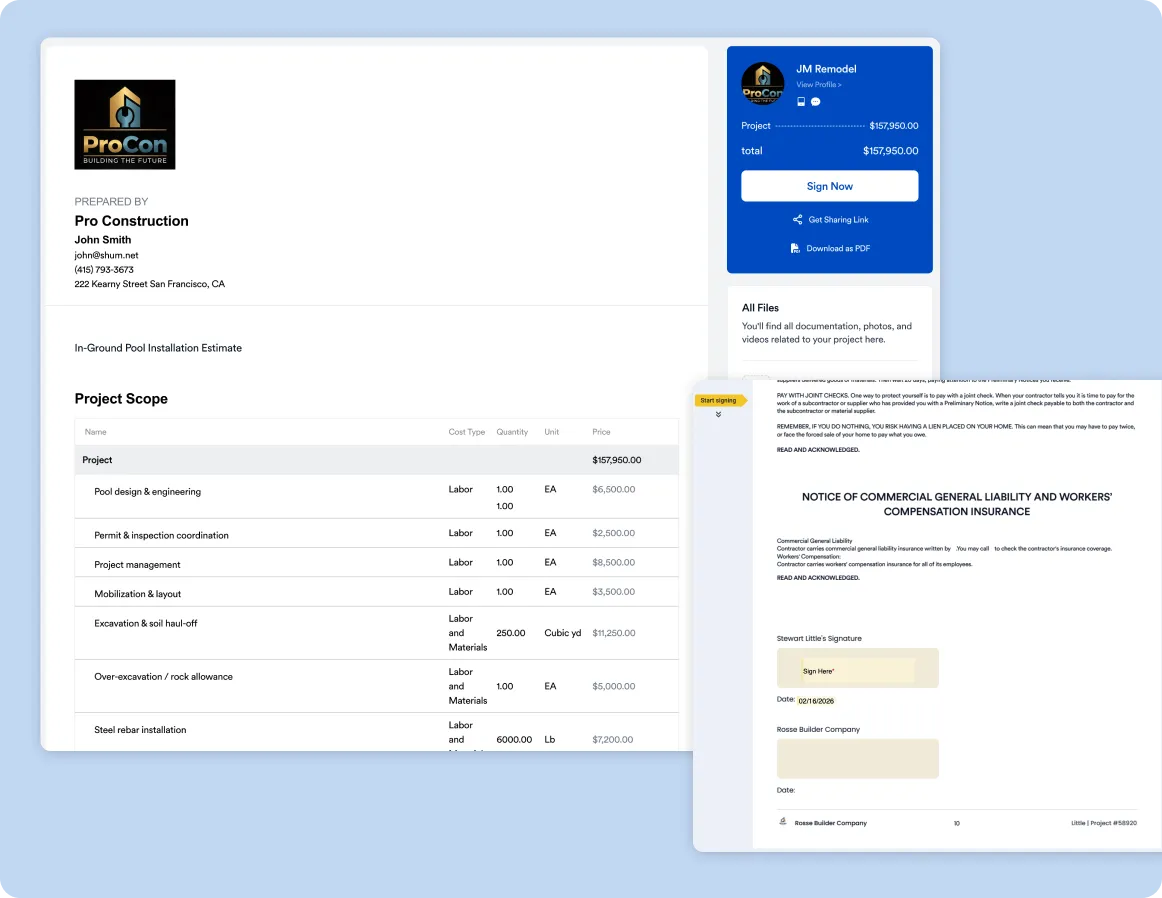 Provide homeowners with secure access to project progress, signed documents, payment schedules, and updates.