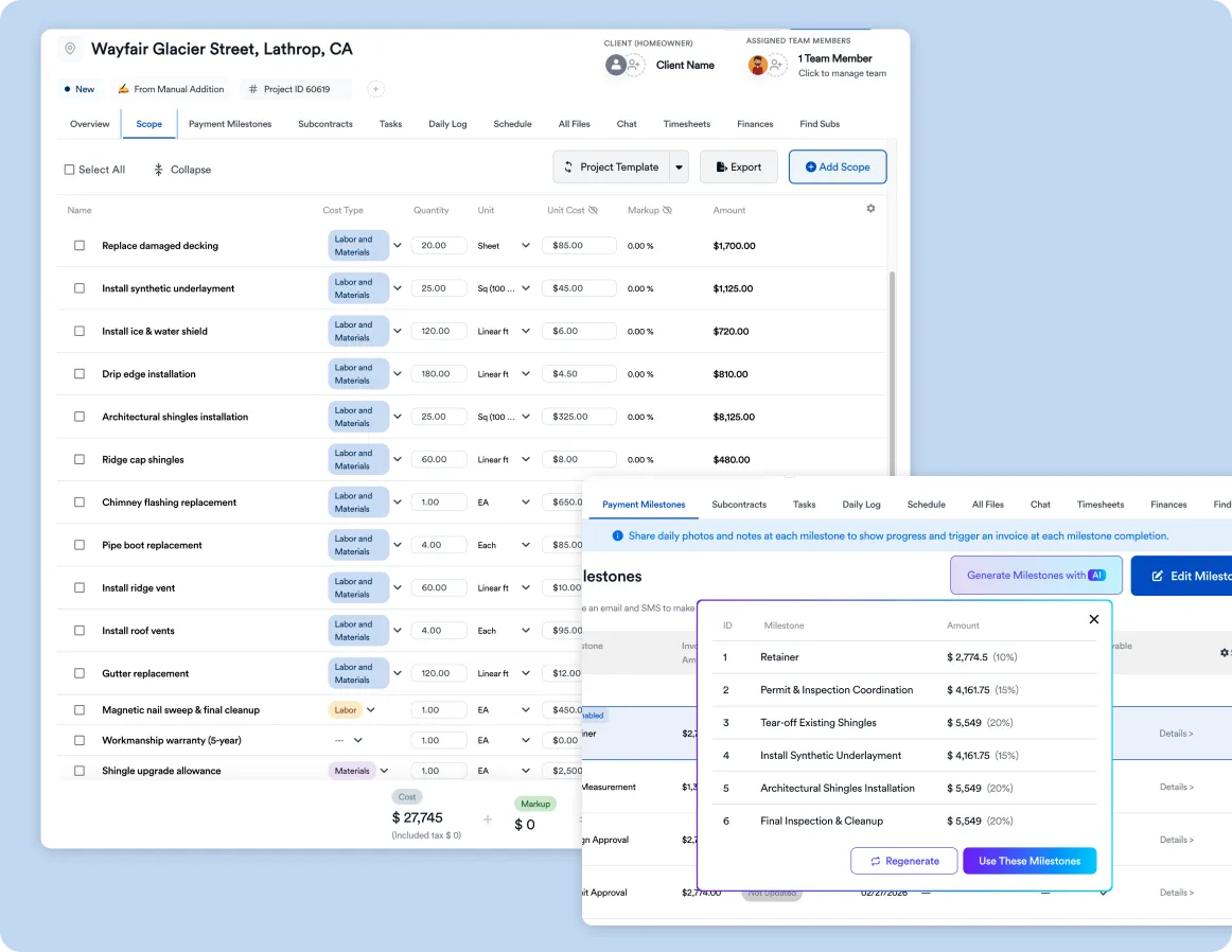 • Assign tasks for tear-off, decking repair, underlayment, shingle install, flashing, ventilation, and cleanup