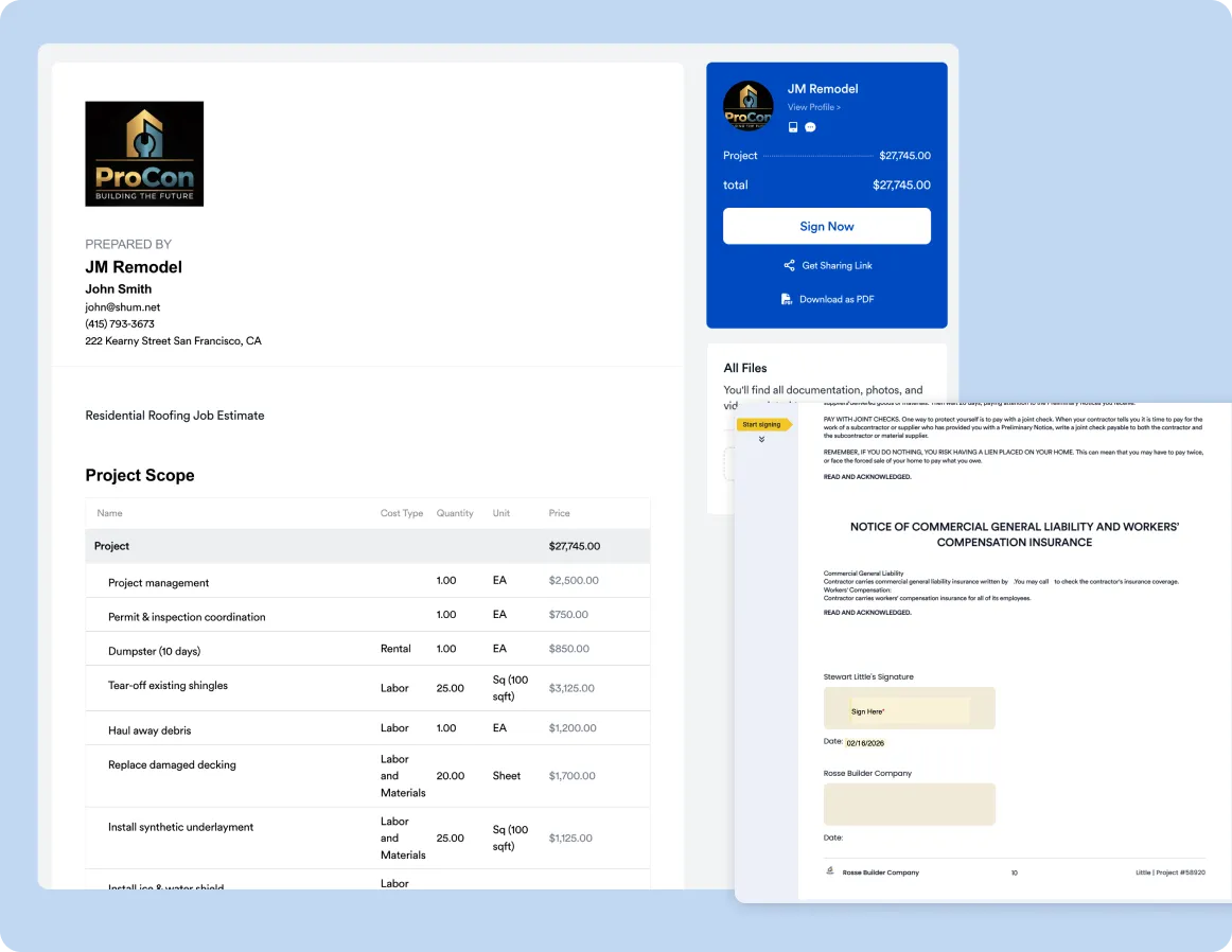 Roofing projects often close quickly — especially after storms. Your proposal process needs to be clear, fast, and professional.