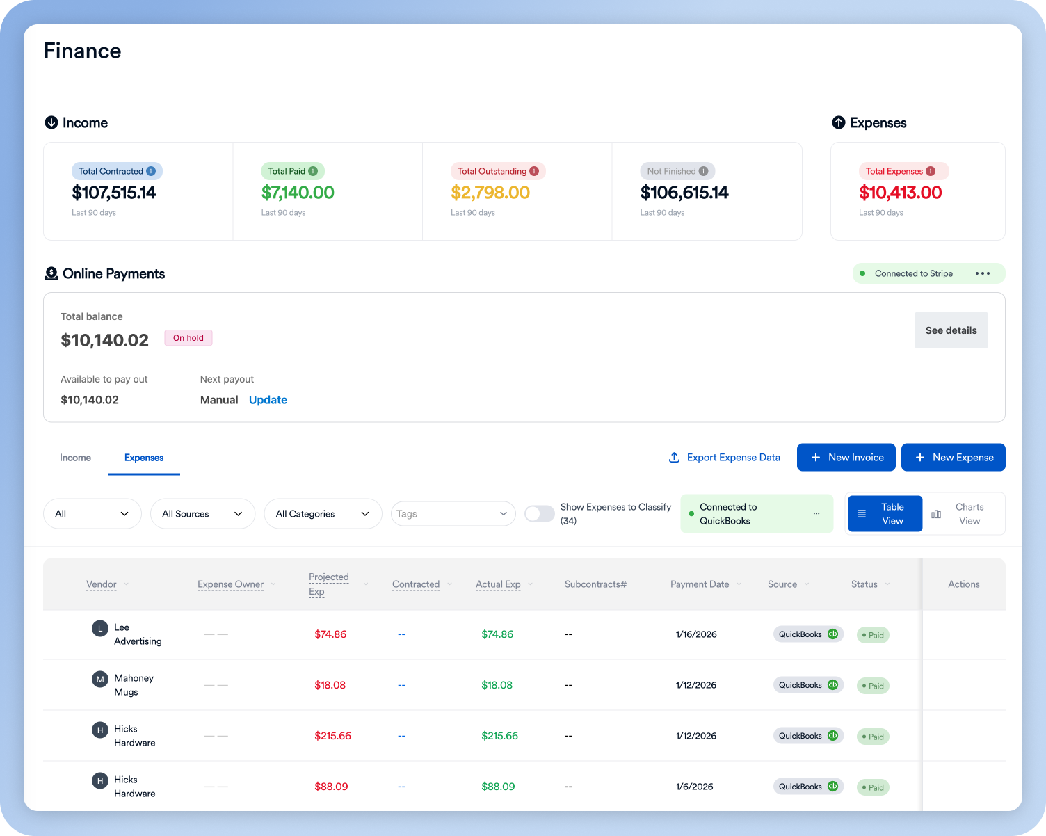 Instead of digging through spreadsheets, Eano gives you a simple financial summary for every job everytime you open the project. See your project budget, expenses, payments received, and remaining balance in one dashboard. This makes it easy to quickly understand whether a project is on track financially.