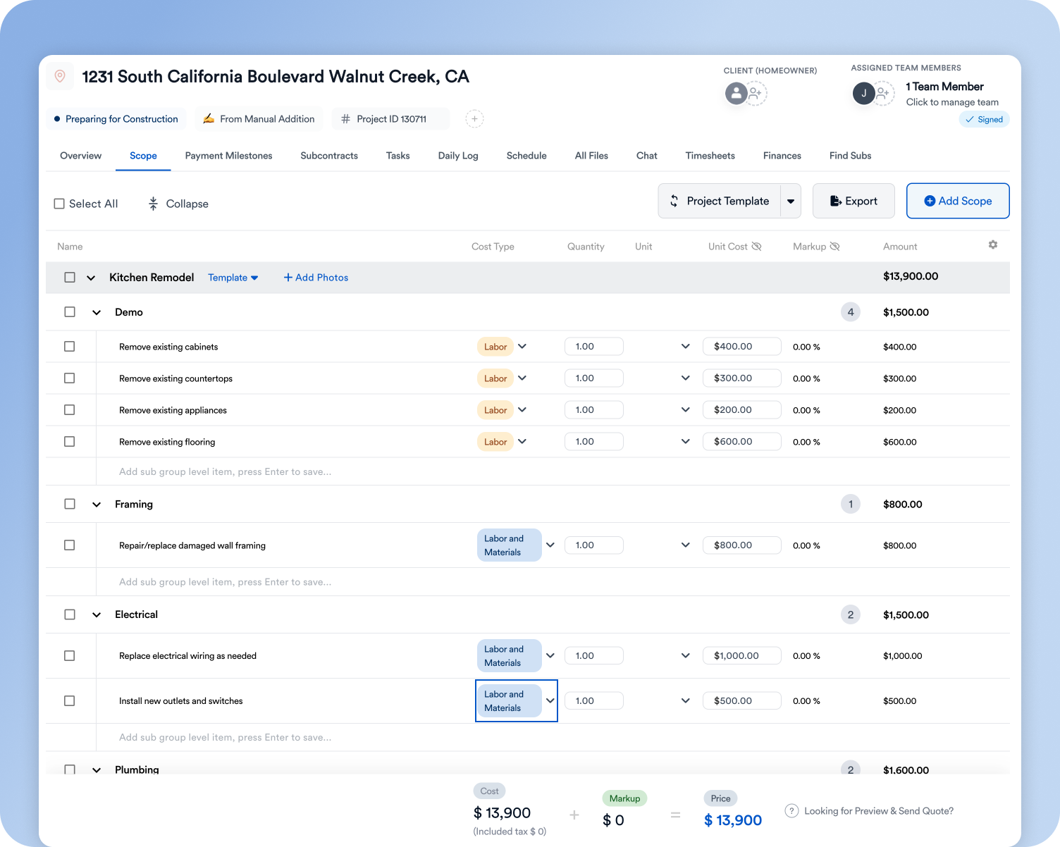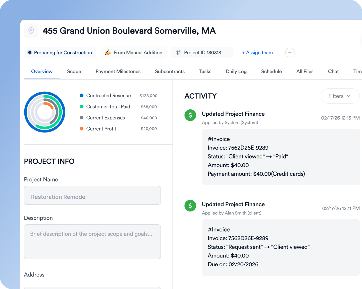 Accurate job costing is essential for protecting profit margins. Eano tracks costs at the line-item level so contractors can see exactly how labor, materials, and subcontractors affect the project budget. As expenses are added to a project, the system updates your financial view automatically, helping you spot overruns early and keep projects profitable.