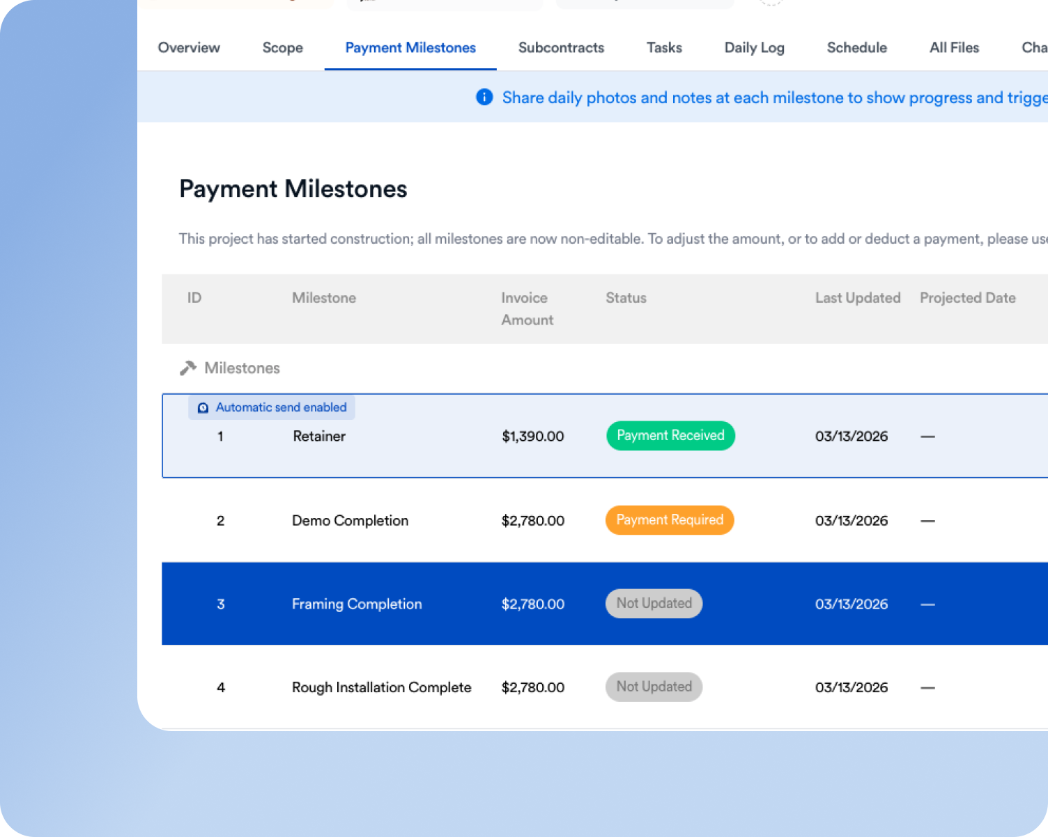 Payment schedules are a critical part of construction financial planning. Eano allows you to set up payment milestones that match the phases of your project. From deposits to progress payments and final invoices, each milestone is connected to your project timeline and contract. This helps contractors maintain predictable cash flow while keeping clients informed about upcoming payments.