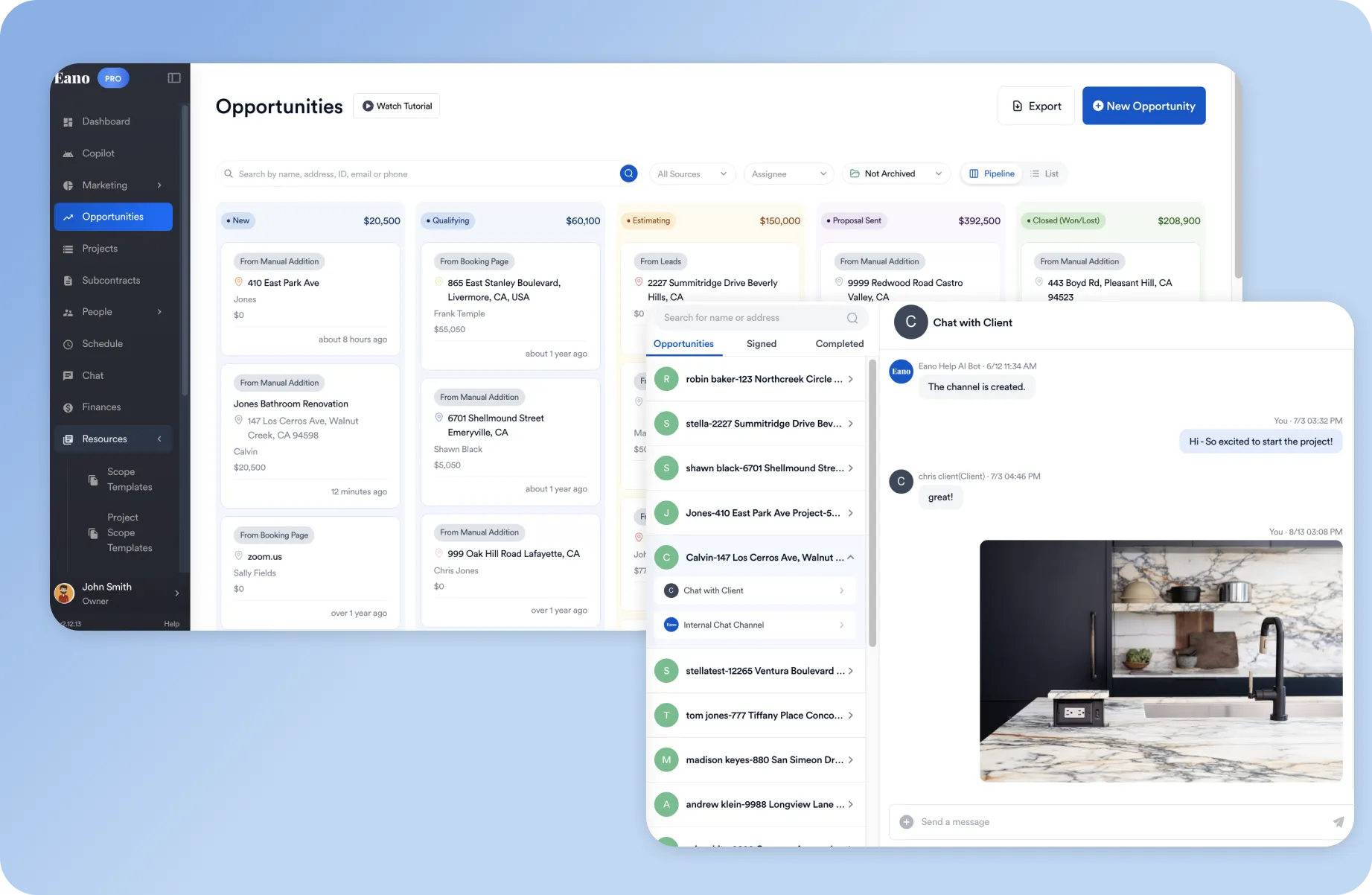 Easily track deals, create accurate estimates, and send proposals to prospective customers with Eano Pro's construction CRM software. Streamline your workflow so your team tracks every prospect in play.