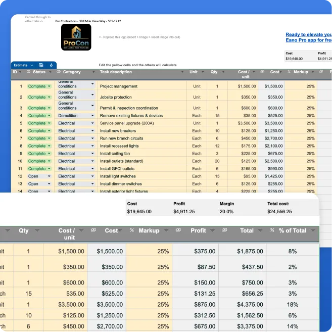The sheet automatically calculates totals and projected profit so you can confirm margin before sending your estimate.