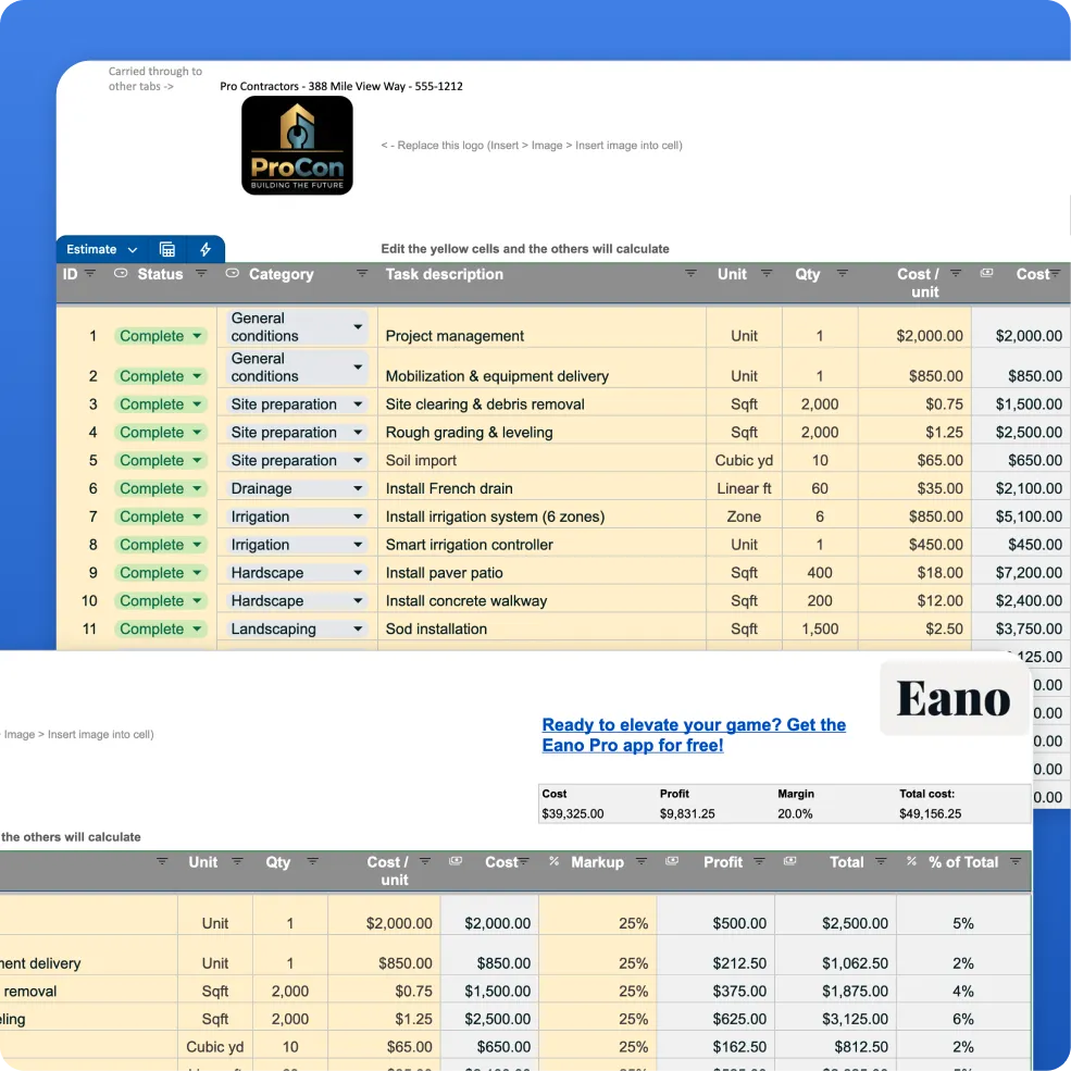 Landscaping projects require clarity. Between materials, labor, equipment, and changing site conditions, small estimating mistakes can impact your margin quickly. This Landscape Estimate Template helps you create organized, professional, client-ready estimates that build trust and win jobs. Whether you're bidding planting jobs, hardscapes, irrigation installs, or full landscape renovations, this template gives you a structured system for quoting confidently.